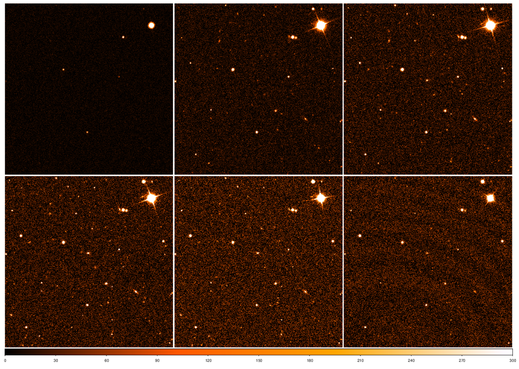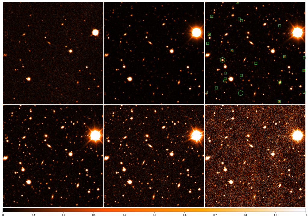 Fig. 2 and 3 show a zoom-in to the individual 30s calexp images and coadded images. The panels correspond to ugrizy (left to right, top to bottom).