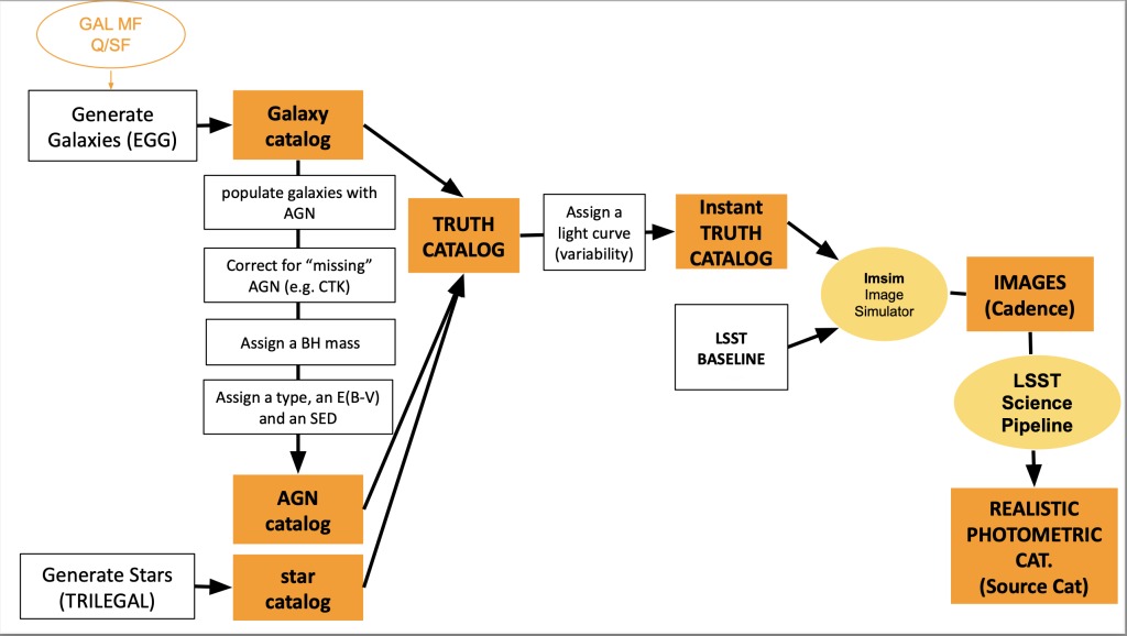 3. Stars: Finally, the Milky Way and Magellanic cloud single and binary stars are added from the publicly available LSST SIM database, which is based on the TRILEGAL code (Girardi+ 2012). Variability is included also for the star catalog.