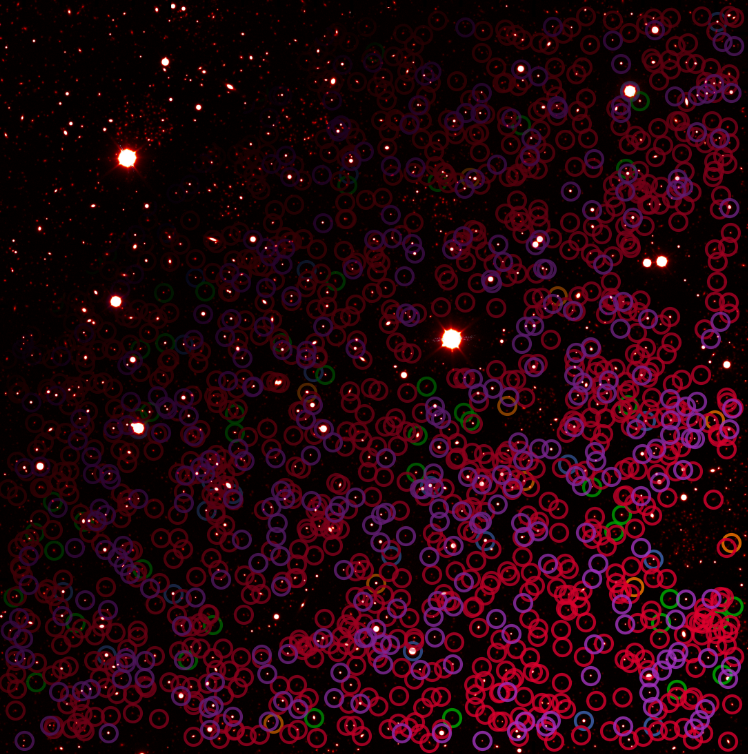 The AGN+galaxy+stars truth catalog is then fed into the LSST image simulation pipeline Imsim (https://www.lsst.org/scientists/simulations/imsim), which takes into account instrumental effects, sky background, and the LSST cadence, to generate simulated multi-band images in the Rubin-LSST bands, i.e. u, g, r, i, z, y (and possibly also Euclid VIS+NIR bands). For the current release, we have used the LSST baseline 4.0. In Fig. 1 we show the r-band image corresponding to 1 patch (0.05deg2) with overplotted type-1 AGN (orange circles), type-2 AGN (green circles), galaxies (red circles) and stars (violet).